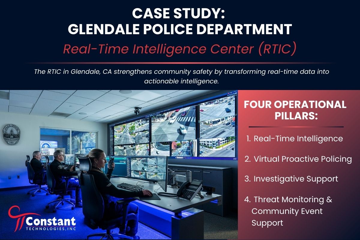 The Glendale Police Department opened its Real-Time Intelligence Center (RTIC) in November 2024. Designed and implemented by Constant Technologies, this RTIC demonstrates Glendale Police Department’s commitment to community safety.